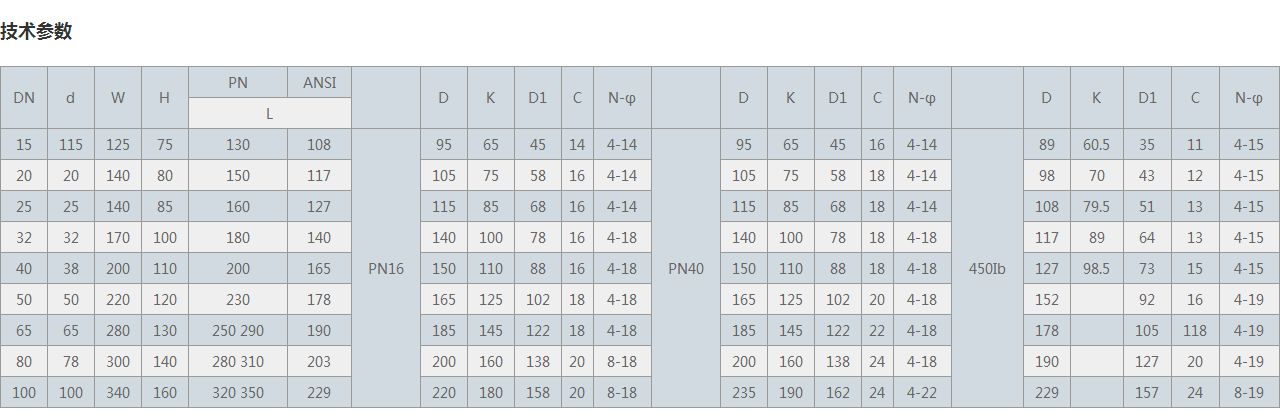 | 15 | 115 | 125 | 75 | 130 | 108 | PN16 | 95 | 65 | 45 | 14 | 4-14 | PN40 | 95 | 65 | 45 | 16 | 4-14 | 450Ib | 89 | 60.5 | 35 | 11 | 4-15 |