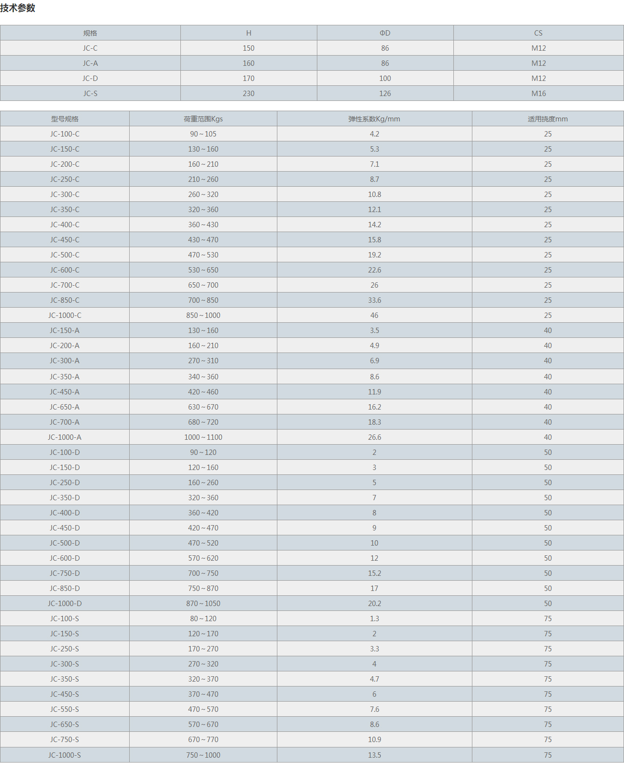 | 型號規格 | 荷重范圍(Kg) | 彈性系數(Kg/mm) | 適用撓度(mm) |
