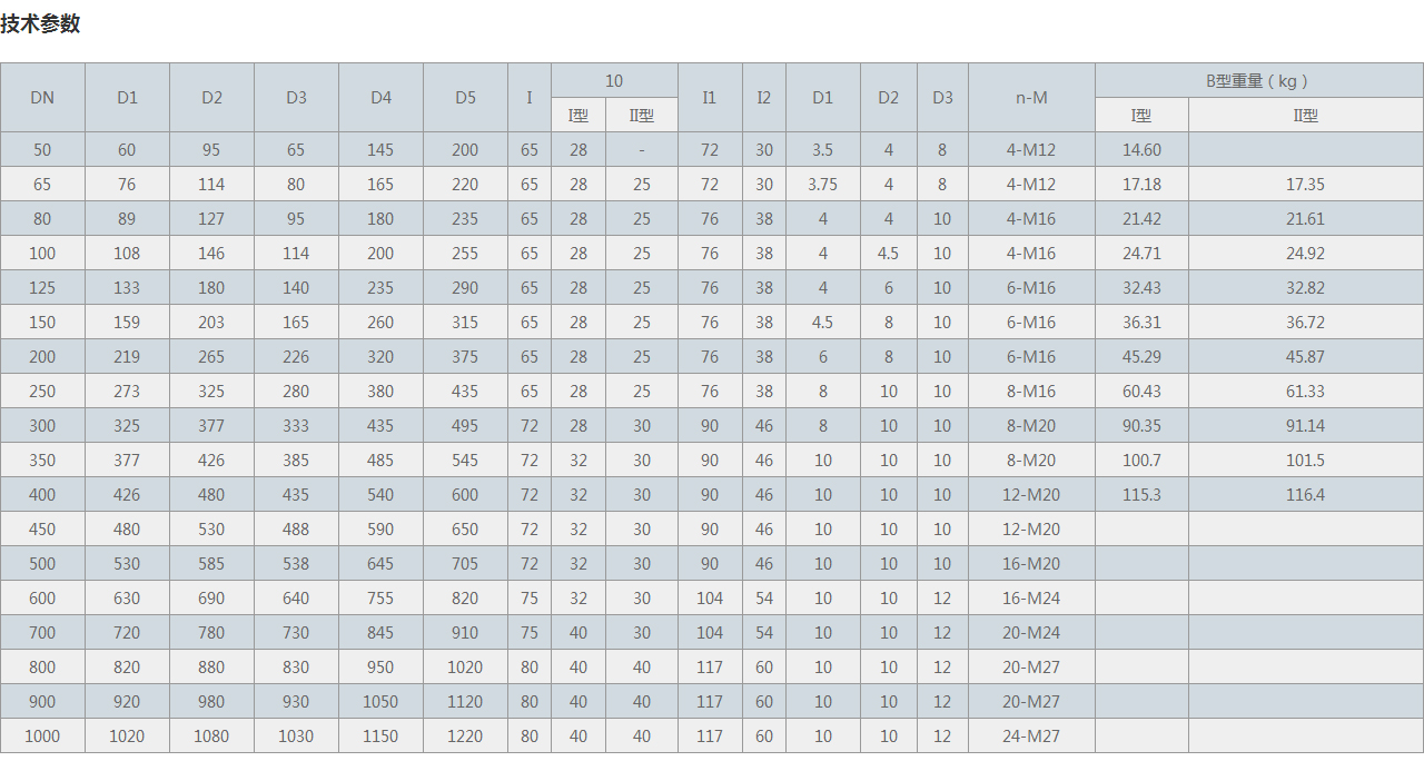 | DN | D1 | D2 | D3 | D4 | D5 | I | 10 | I1 | I2 | D1 | D2 | D3 | n-M | B型重量(kg) | ||