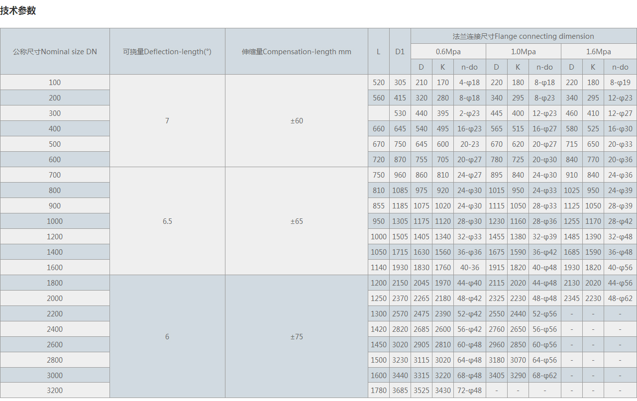 可撓量Deflection-length(°) 伸縮量Compensation-length mm L D1 法蘭連接尺寸Flange connecting dimension