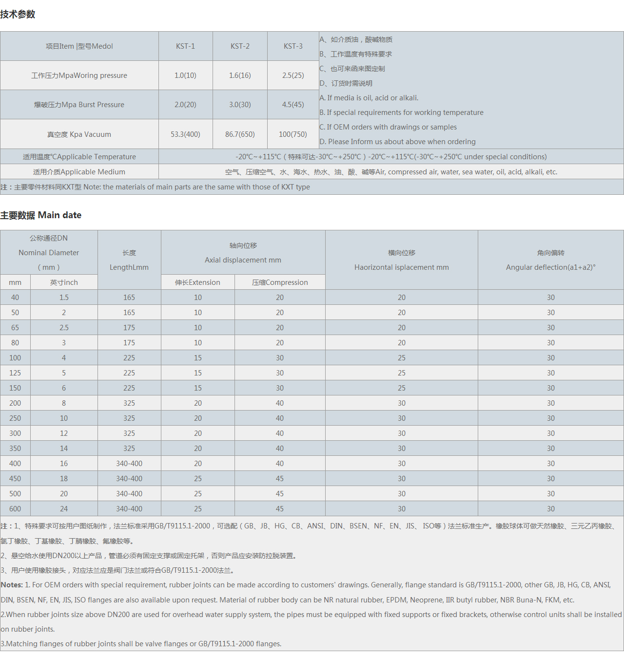 | 注:1、特殊要求可按用戶圖紙制作,可選配(GB、JB、HG、CB、ANSI、DIN、BSEN、NF、EN、JIS、 等)法蘭標準生產。橡膠球體可做天然橡膠、三元乙丙橡膠、氯丁橡膠、丁基橡膠、丁腈橡膠、氟橡膠等。 2、懸空給水使用DN200以上產品,管道必須有固定支撐或固定托架,否則產品應安裝防拉脫裝置。 3、用戶使用橡膠接頭,對應法蘭應是閥門法蘭。 Notes: 1. For OEM orders with special requirement, rubber joints can be made according to customers' drawings. Generally, flange standard is , other GB, JB, HG, CB, ANSI, DIN, BSEN, NF, EN, JIS, flanges are also available upon request. Material of rubber body can be NR natural rubber, EPDM, Neoprene, IIR butyl rubber, NBR Buna-N, FKM, etc. 2.When rubber joints size above DN200 are used for overhead water supply system, the pipes must be equipped with fixed supports or fixed brackets, otherwise control units shall be installed on rubber joints. 3.Matching flanges of rubber joints shall be valve flanges or flanges. |